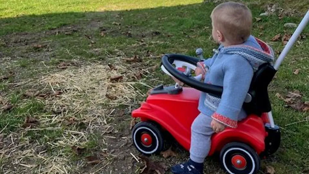Vinzent cruised fleißig mit seinem Bobby Car über den Hof.