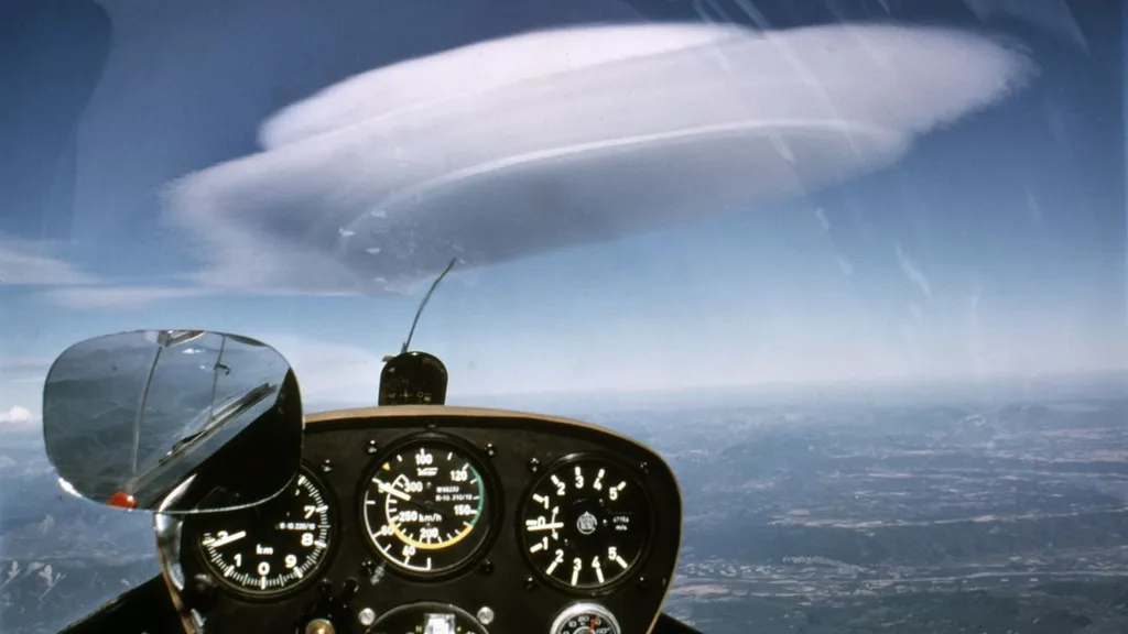 Manchmal erlaubt sich die Erdatmosphäre einen Spaß und formt Wolken zu UFOs. Es sind aber lediglich Lenticularis-Wolken ("Linsen"-Wolken). Sie entstehen, wenn eine Luftschicht durch einen Berg angehoben wird und ortfest erscheint (wie eine "stehende Welle").