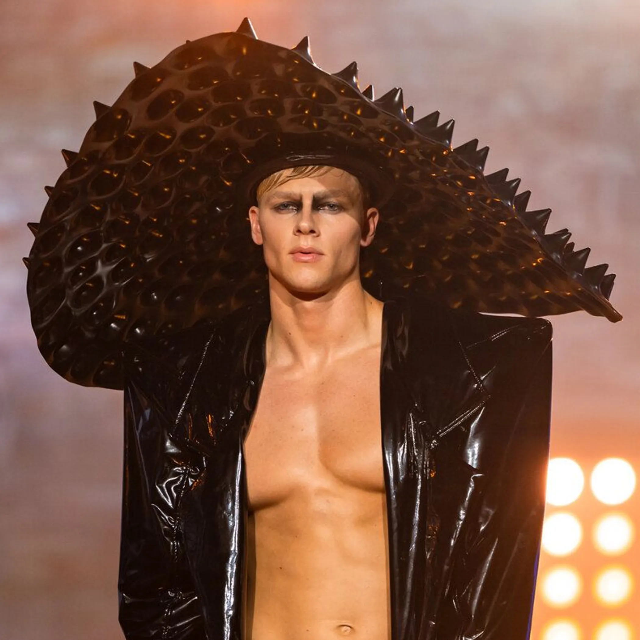 Yanneck eröffnet den Elimination-Walk - und sein Look kann sich sehen lassen! Er trägt eine tiefsitzende, metallische Hose mit auffälligem Flammenmuster, dazu enganliegende Handschuhe im gleichen Stil. Sein freier Oberkörper wird bewusst als Teil des Looks inszeniert.