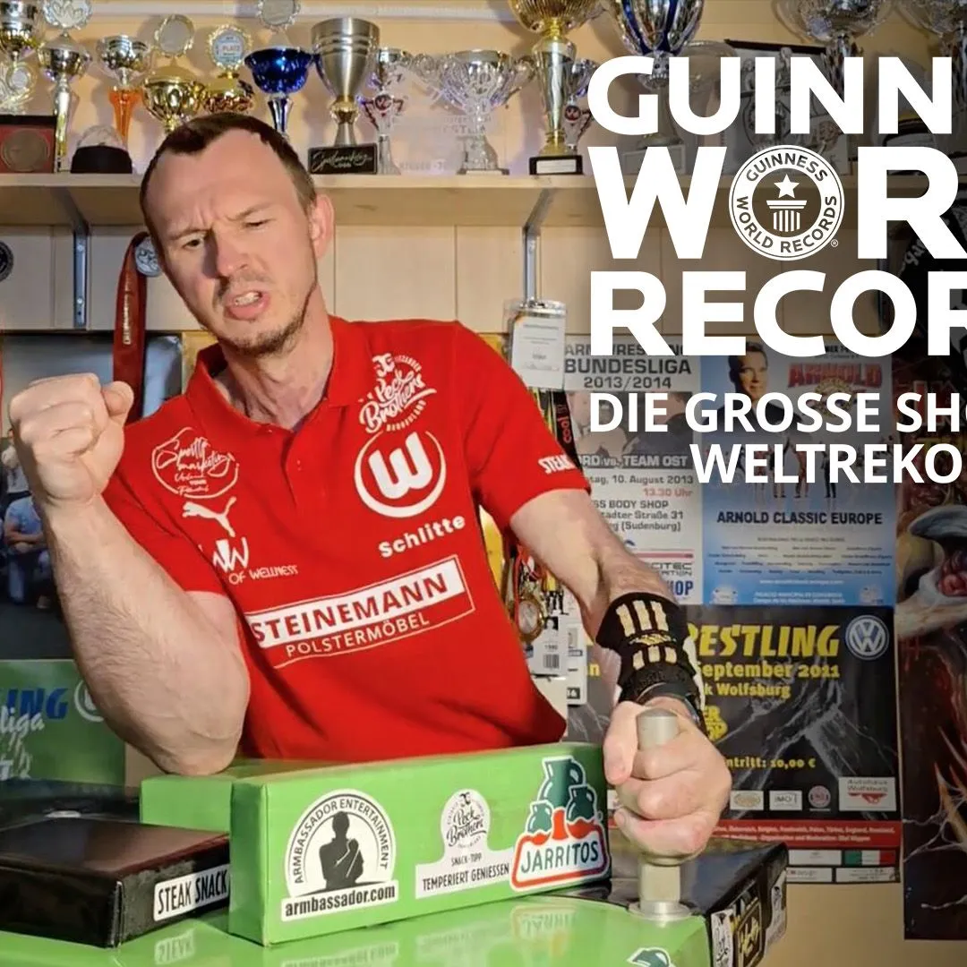 Mittlerweile sind leider beide Shows ausverkauft. Es gibt allerdings noch eine Möglichkeit, an der "Guinness World Records"-Show teilzunehmen - und sogar einen Rekordversuch zu unterstützen: Armwrestling-Weltmeister Matthias Schlitte will in 24 Stunden gegen mindestens 1025 Herausforder:innen ein Match gewinnen - mitten in München, jede:r ist eingeladen. Alle Informationen zum Rekordversuch und zur Teilnahme findest du hier.